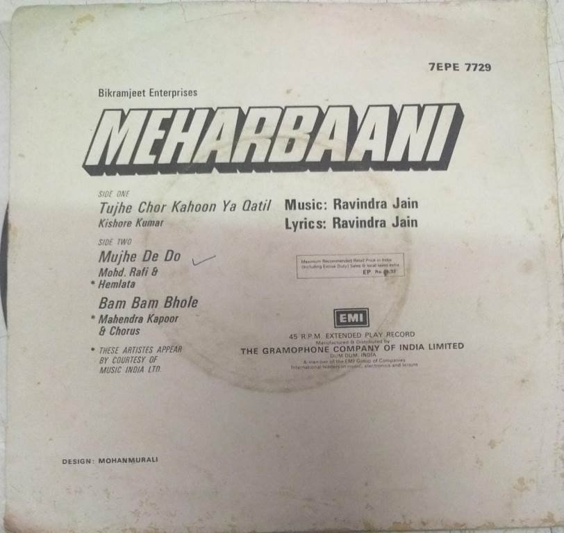 Meharbani Hindi Film EP Vinyl Record by Ravindra jain