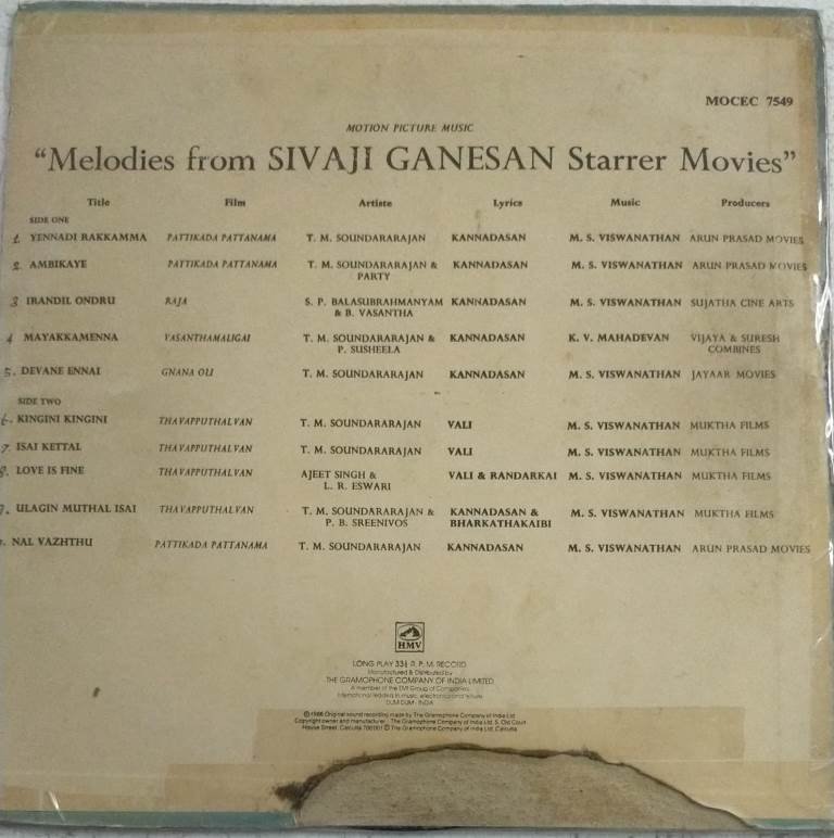 Melodies from Sivaji Ganesan Starrer Movies Tamil Film LP Vinyl Record by M S Viswanathan