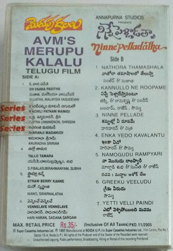 Merupu Kalalu- Ninne Pelladathu Telugu Film Audio Cassette by AR Rahman (sealed pack)