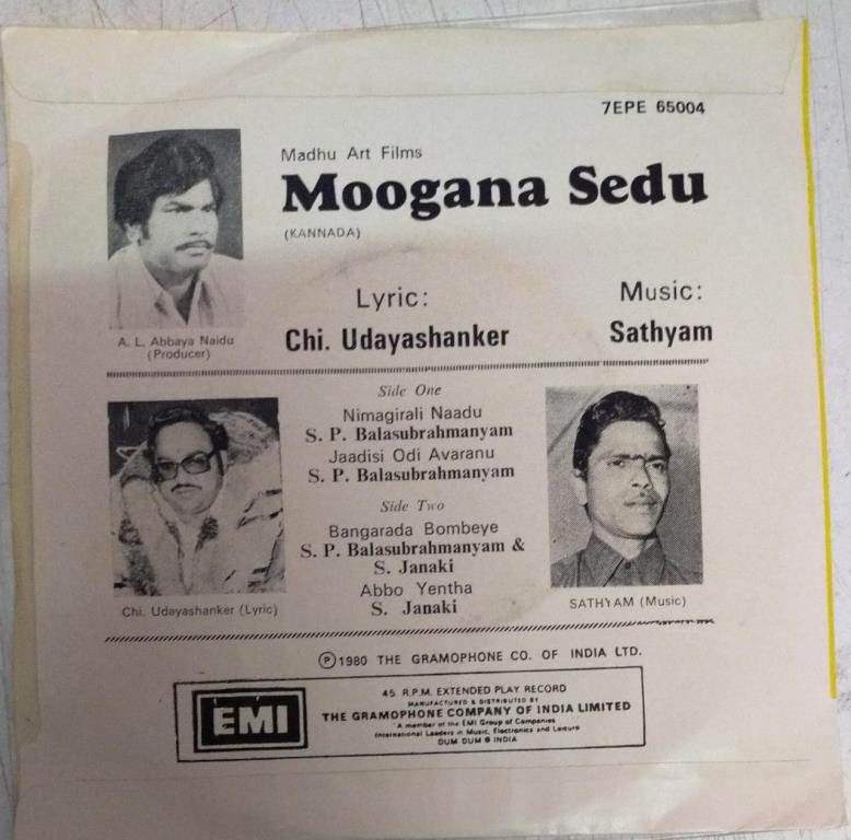 Moogana Sedu Kannada Film EP Vinyl Record by Sathyam