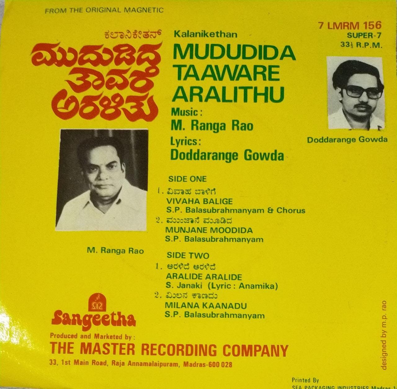 Muddudida Taaware Aralithu Kannada Film EP Vinyl Record by M Ranga Rao
