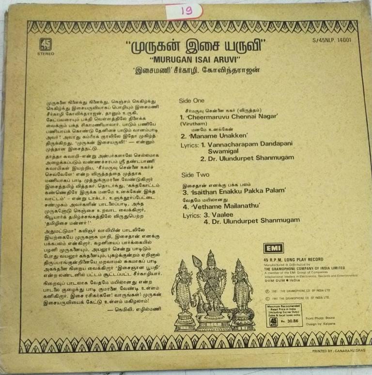 Murugan Isai Aruvi Tamil Devotinal songs LP Vinyl Record by Seerkhazhi S Govindarajan