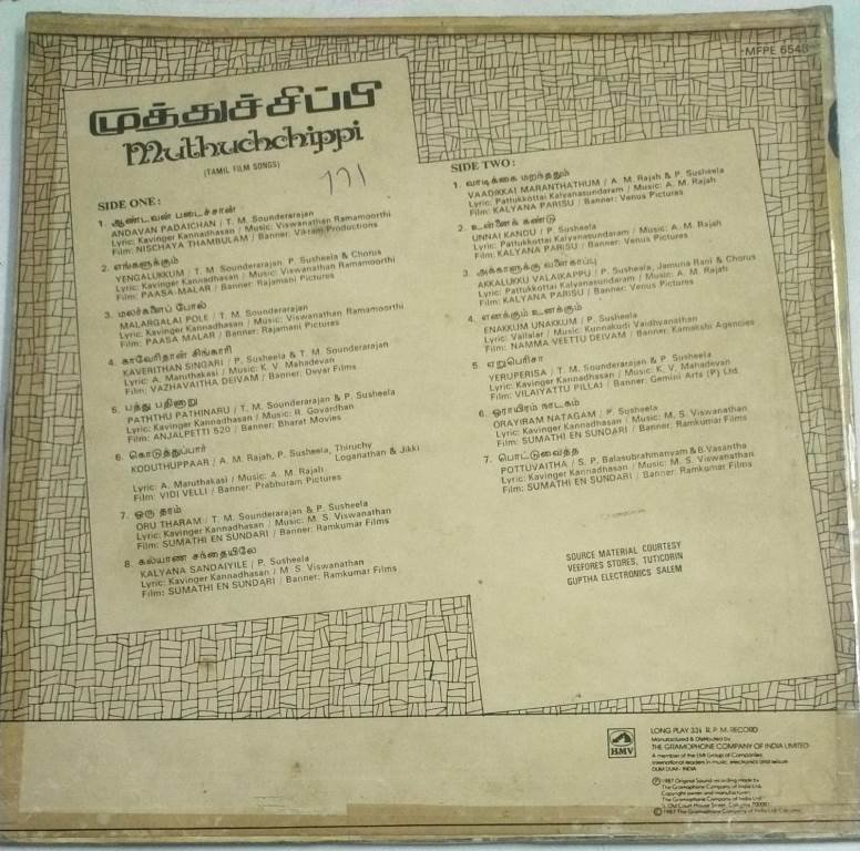 Muthusippi Tamil Film Hit songs LP Vinyl Record