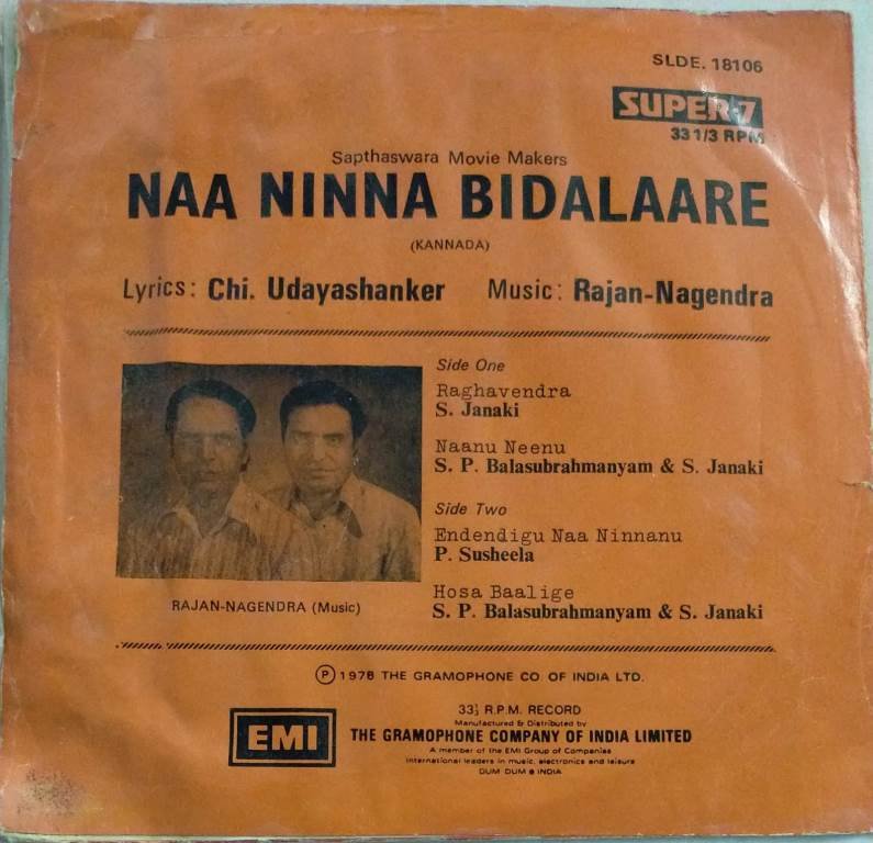 Naa Ninna Bidalaare Kannada Film EP Vinyl Record by Rajan Nagendra