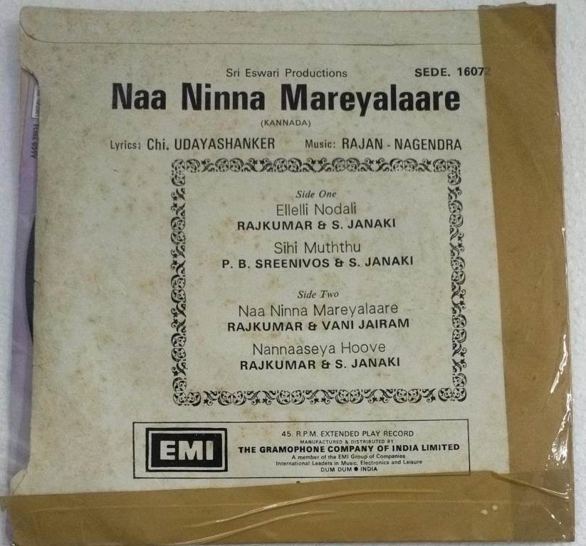Naa Ninna Mareyalaare Kannada Film EP Vinyl Record by Rajan Nagendra