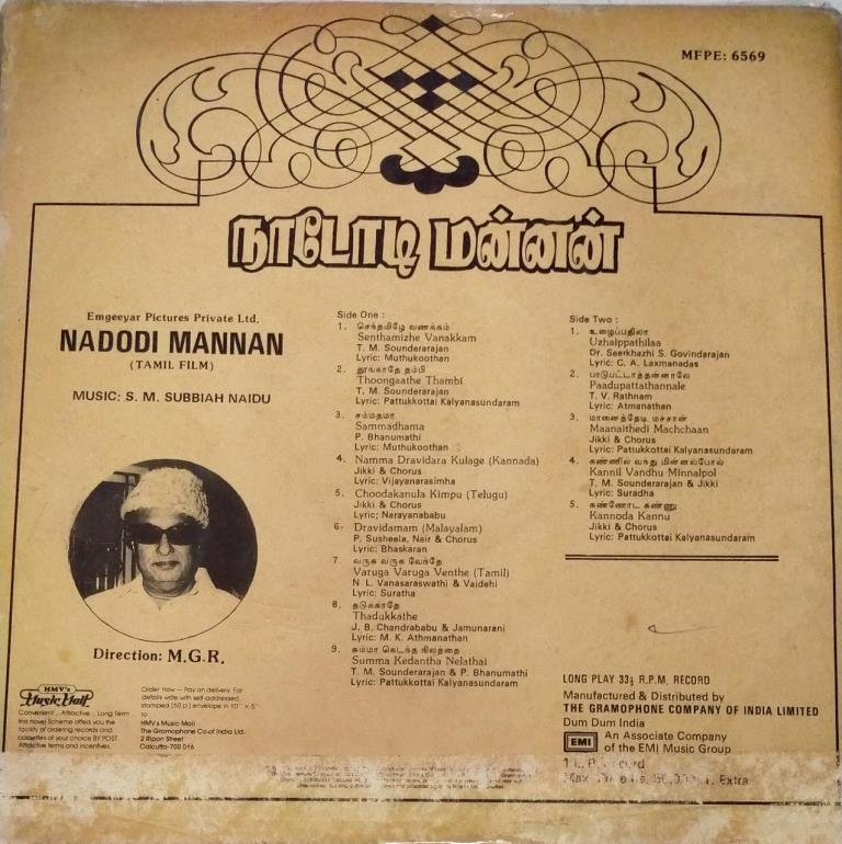 Nadodi Mannan Tamil Film LP Vinyl Record by S M Subbiah Naidu