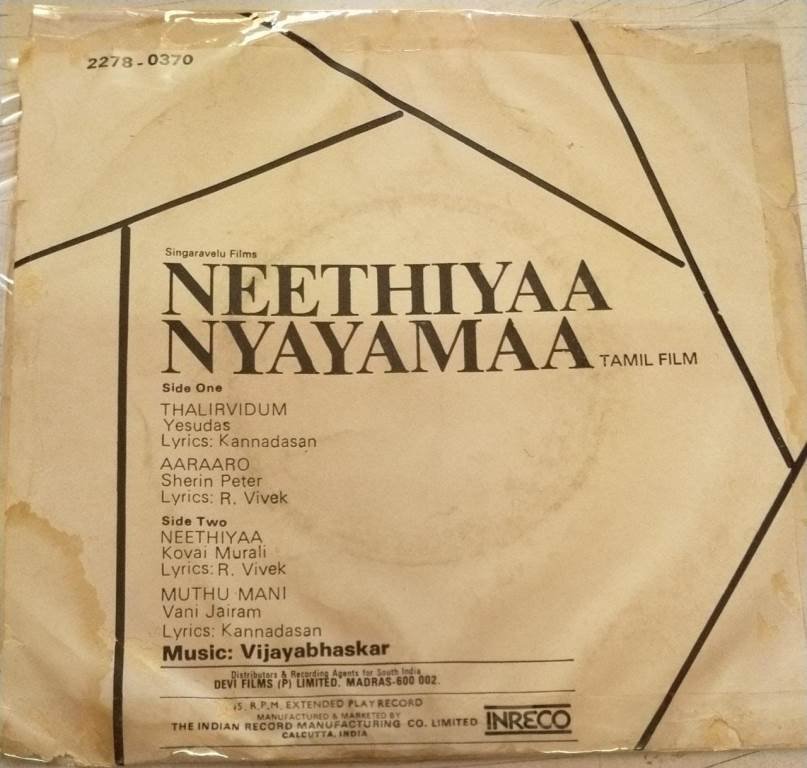 Neethiyaa Nyayamaa Tamil Film EP Vinyl Record by Vijayabhaskar