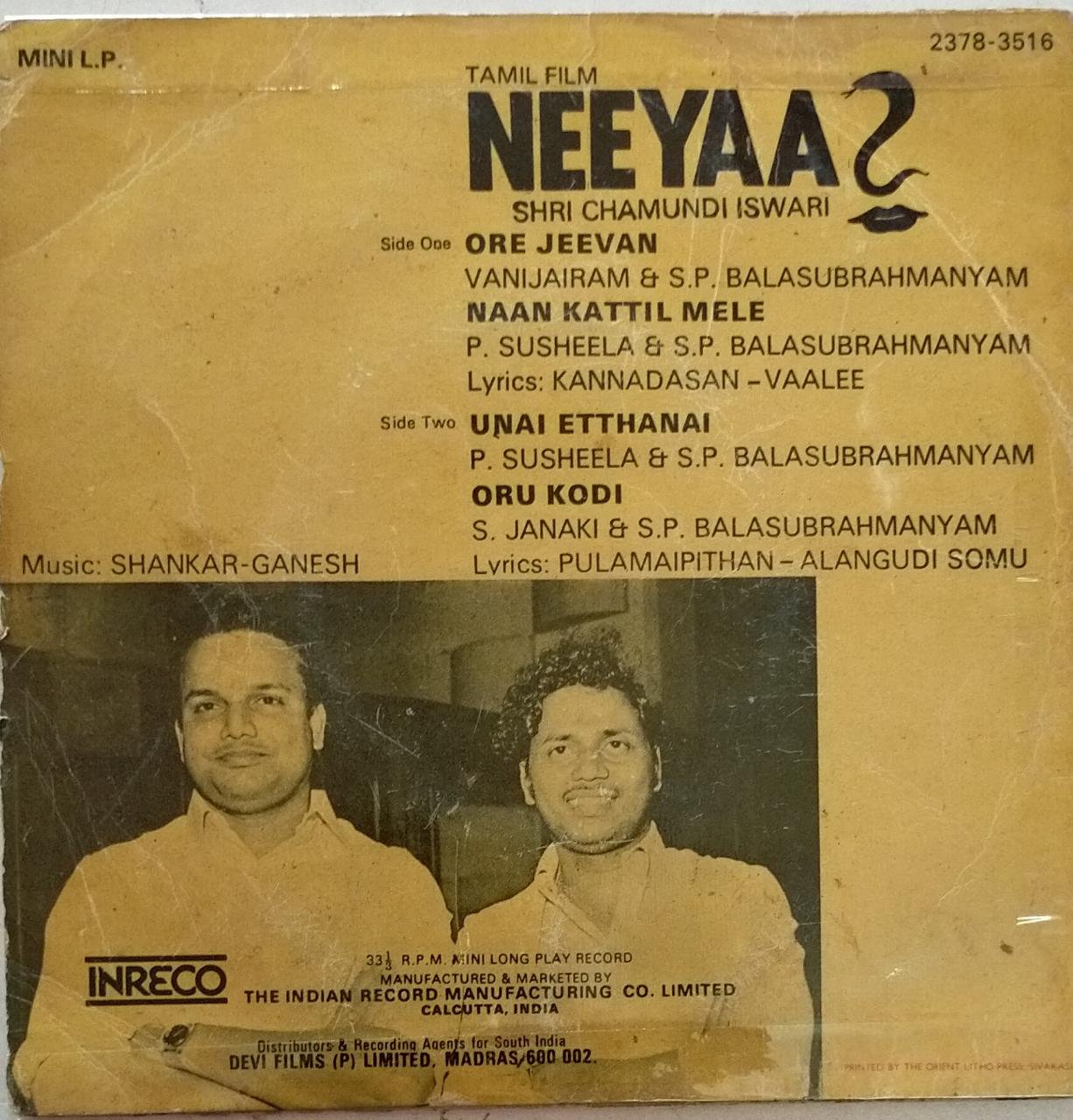 Neeyaa Tamil Film EP Vinyl Record by Shankar Ganesh