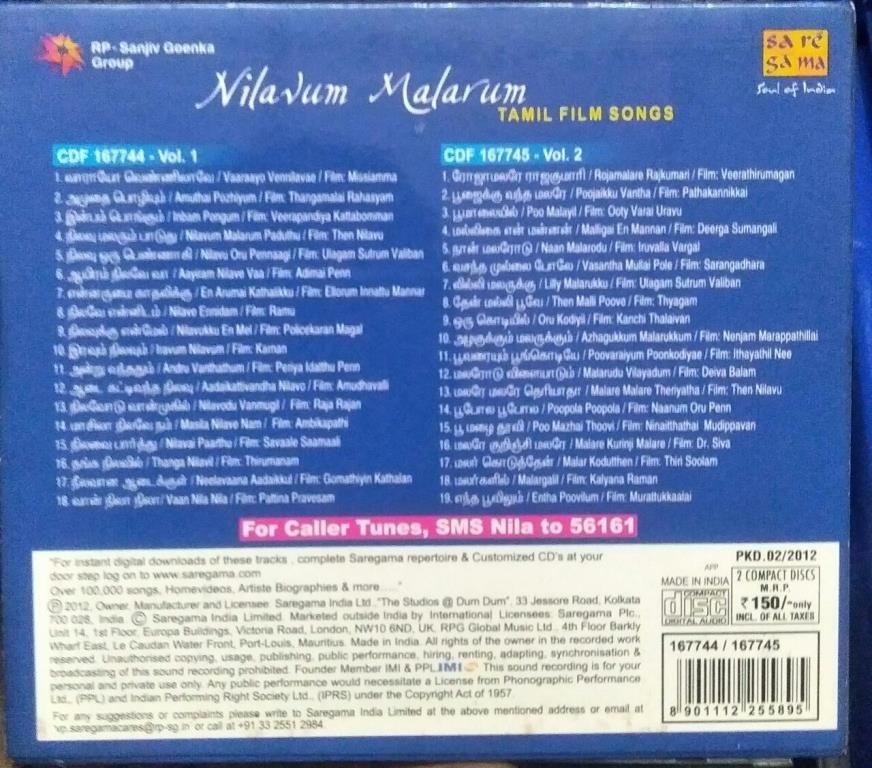 Nilavum Malarum Tamil Film songs Audio CD (2 CD Pack)