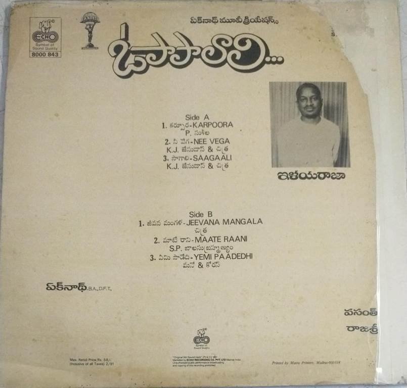 O Pappa Lali Telugu Film LP Vinyl Record by Ilayaraaja