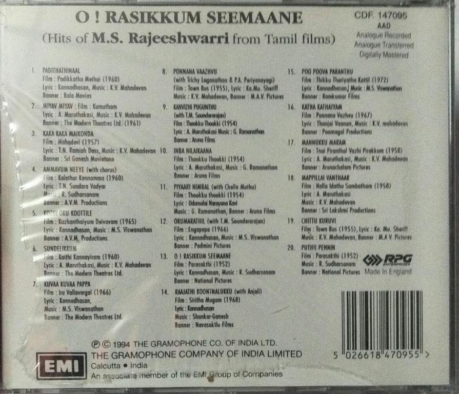 O Rasikkum Seemaane hits of Rajeshwari from Tamil Films Audio CD