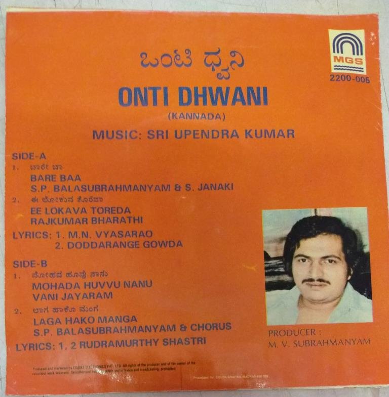 Onti Dhwani kannada Film EP VInyl Record by Upendrakumar