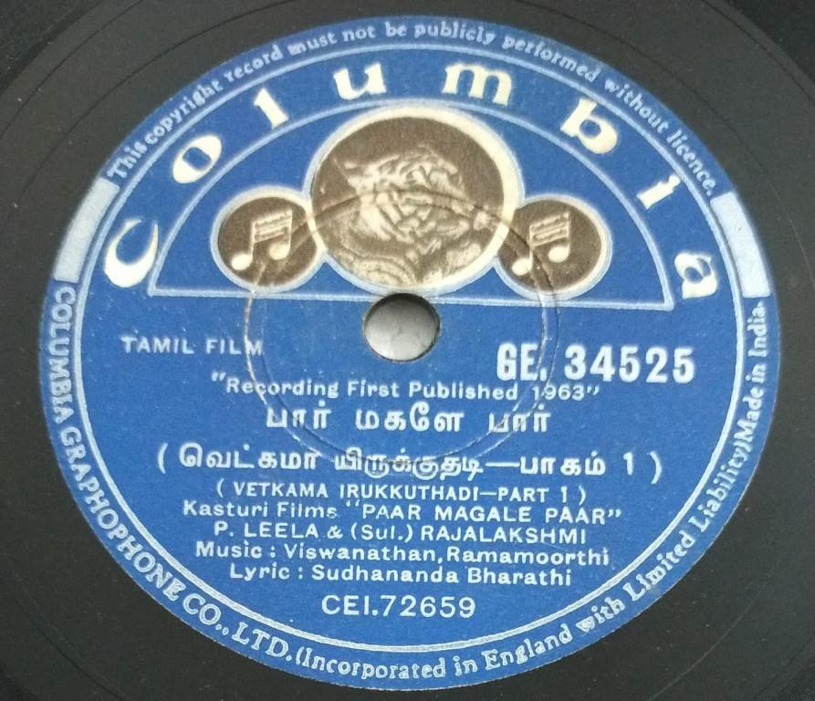 Paar Magale Paar Tamil Film 78 RPM Gramophone record GE 34525