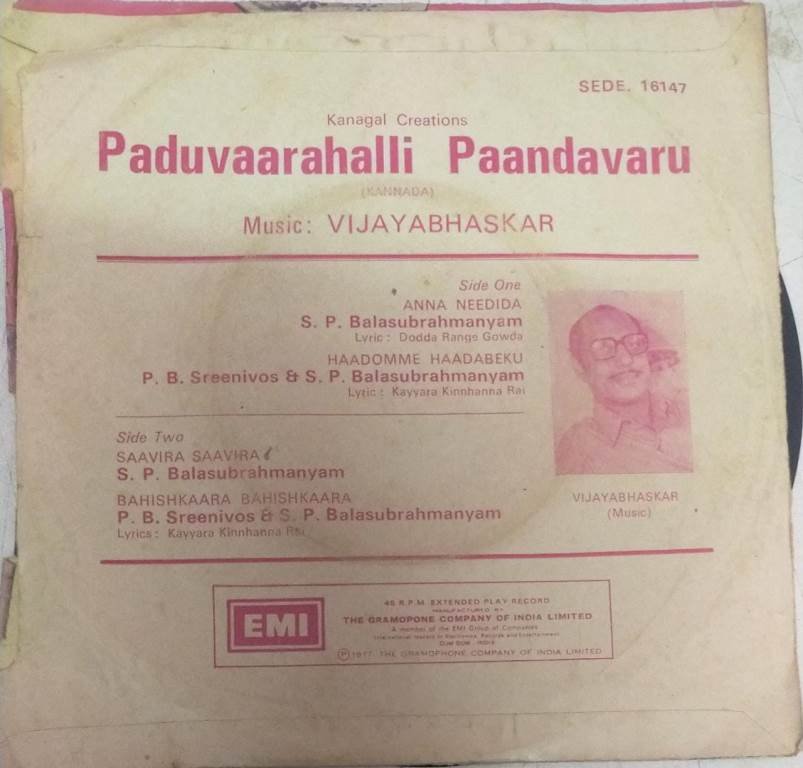 Paduvaarahalli Paandavaru Kannda film EP Vinyl Record by Vijayabhaskar