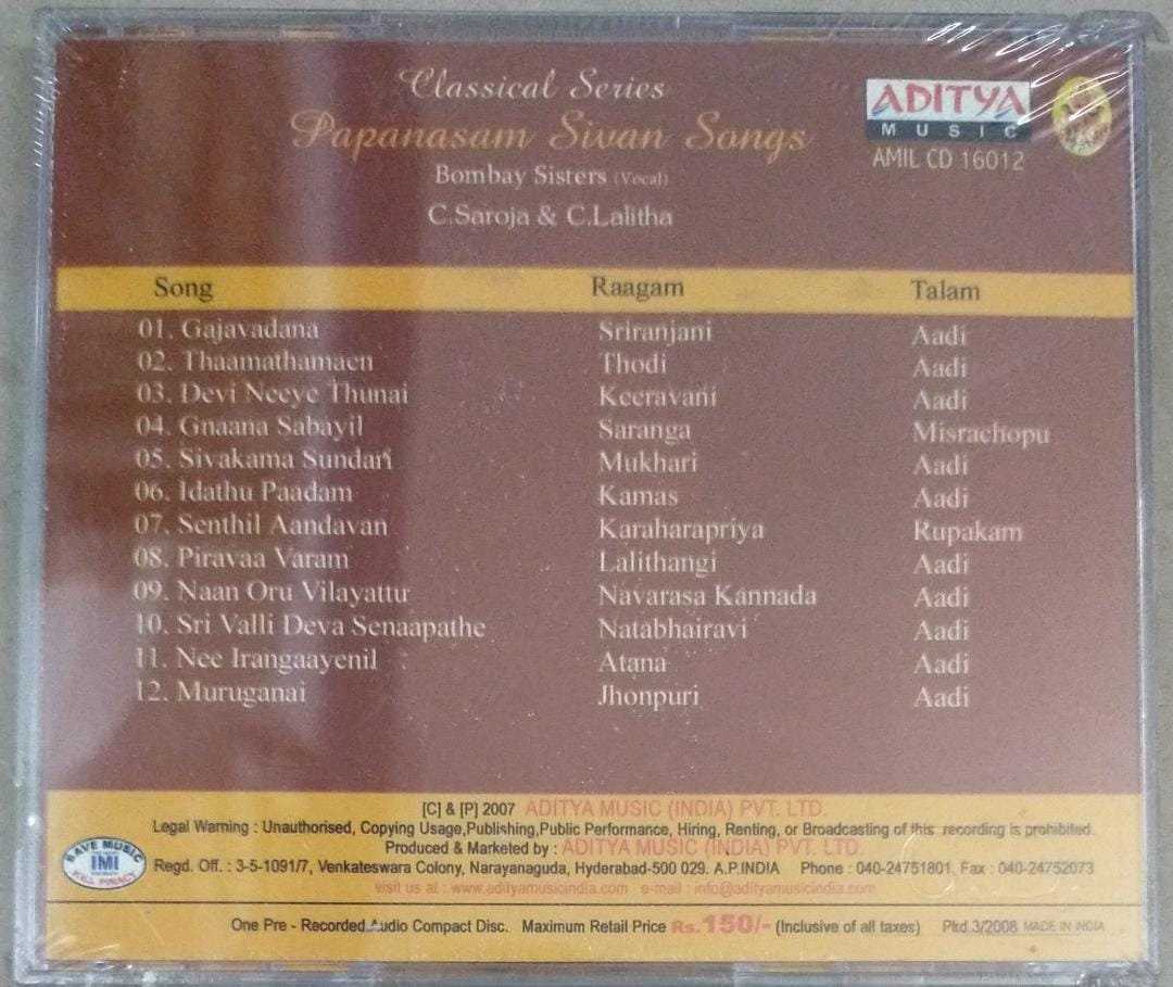Papanasam Sivan songs Classical Audio CD by Bombay Sisters