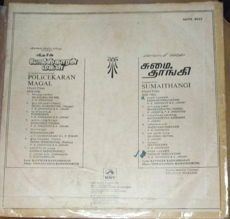 Policekaran Magal- Sumaithangi Tamil Film LP Vinyl Record by MS Viswanathan