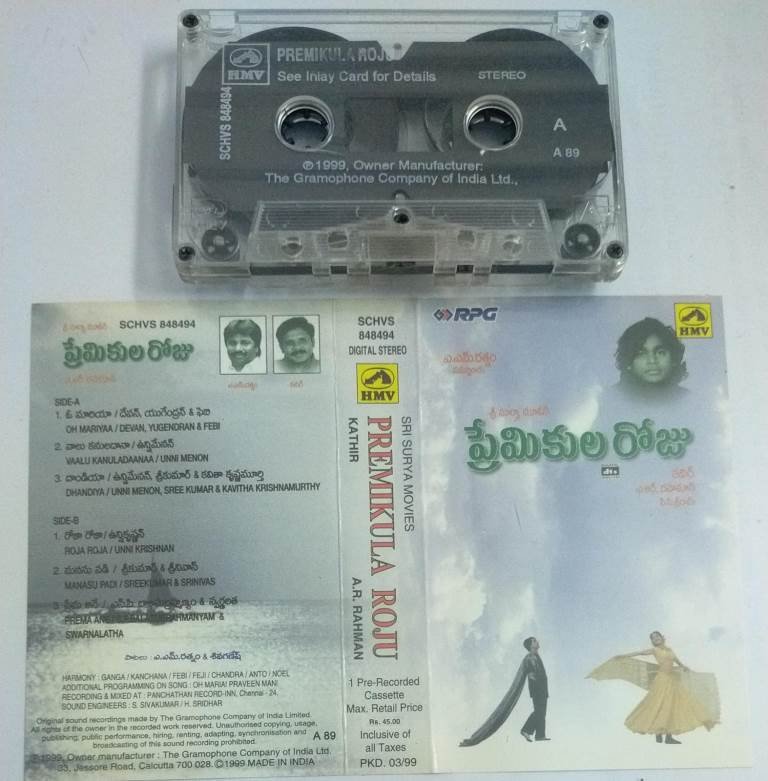 Premikula Roju Telugu Film songs Audio Cassette by A R Rahman