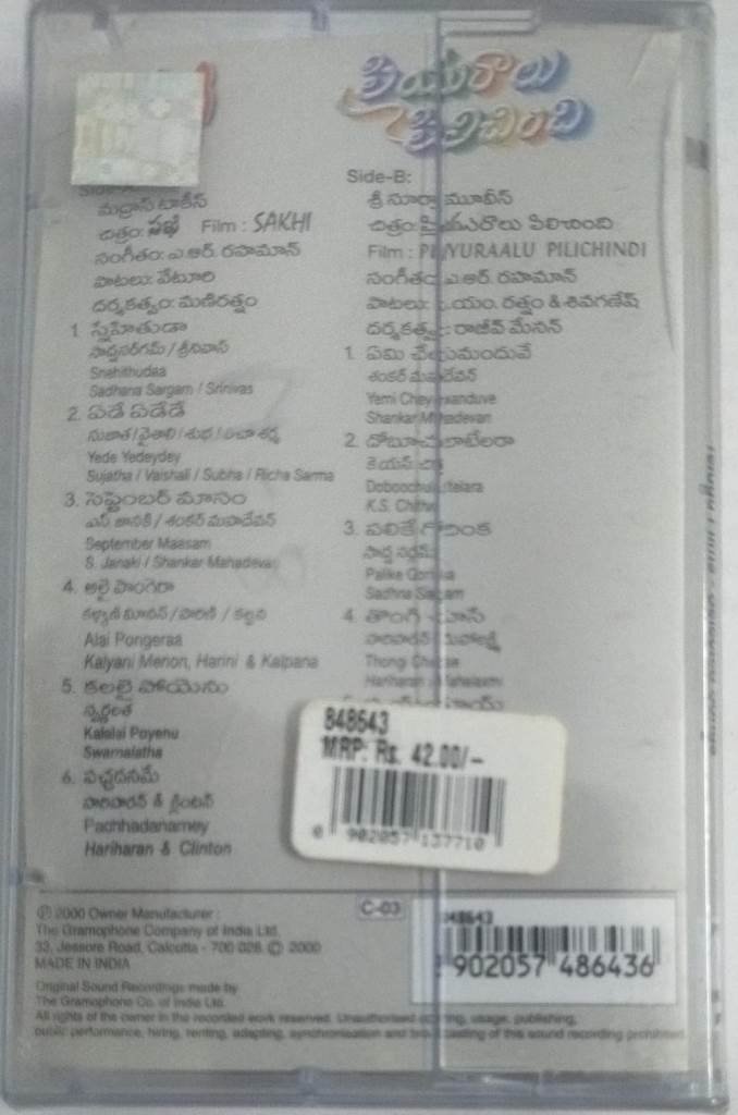 Priyuraalu Pilichindi – Sakhi Telugu Film Audio Cassette by A R Rahman (sealed pack)