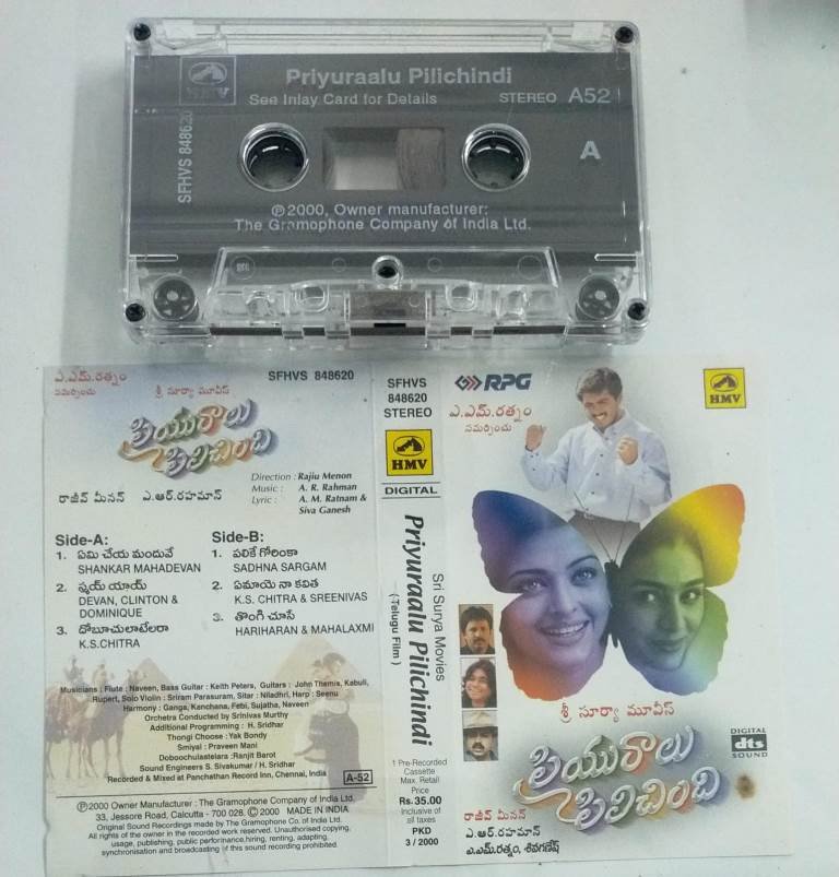 Priyuraalu Pillichindi Telugu Film Audio Cassette by AR Rahman
