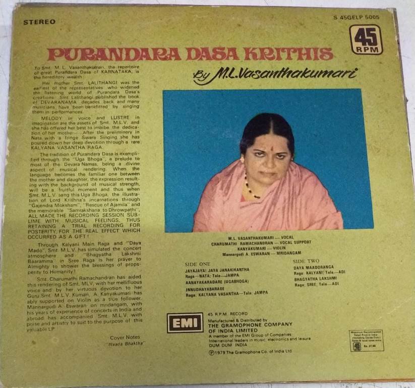 Purandaradasa Krithana Kannada Devotional LP VInyl Record by M L Vasanthakumari