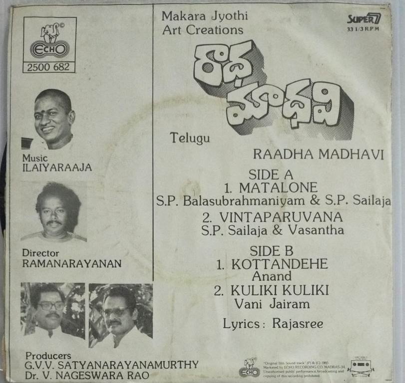 Raadha Madhavi Telugu Film EP Vinyl Record by Ilayaraaja