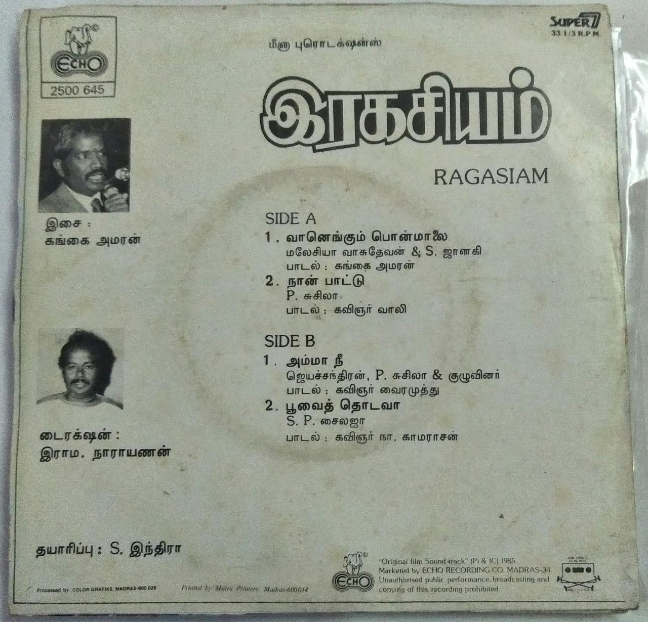 Ragasiyam Tamil Film Super 7 EP Vinyl Record by Gangai Amaren