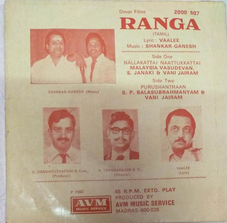 Ranga Tamil Film EP Vinyl Record by Shankar Ganesh