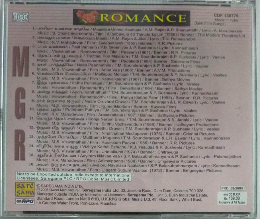 Romance MGR Starrer Tamil film hits Audio CD