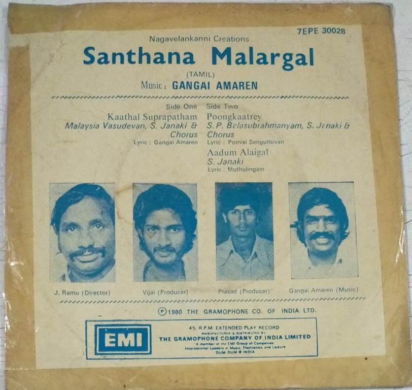 Santhana Malargal Tamil Film EP Vinyl Record by Gangai Ameran