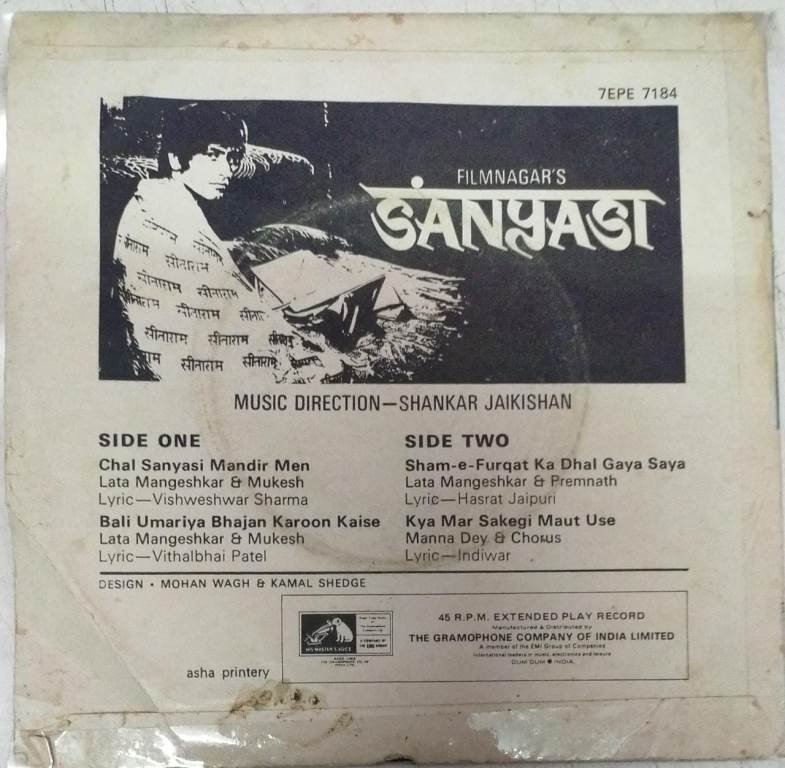 Sanyasi Hindi Film EP Vinyl Record by Shankar Jaikishan