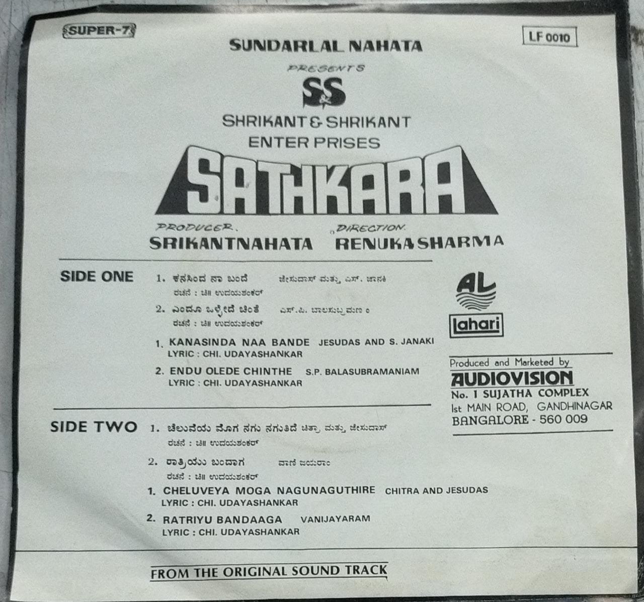 Sathkara Kannada Film EP Vinyl Record by Sathyam
