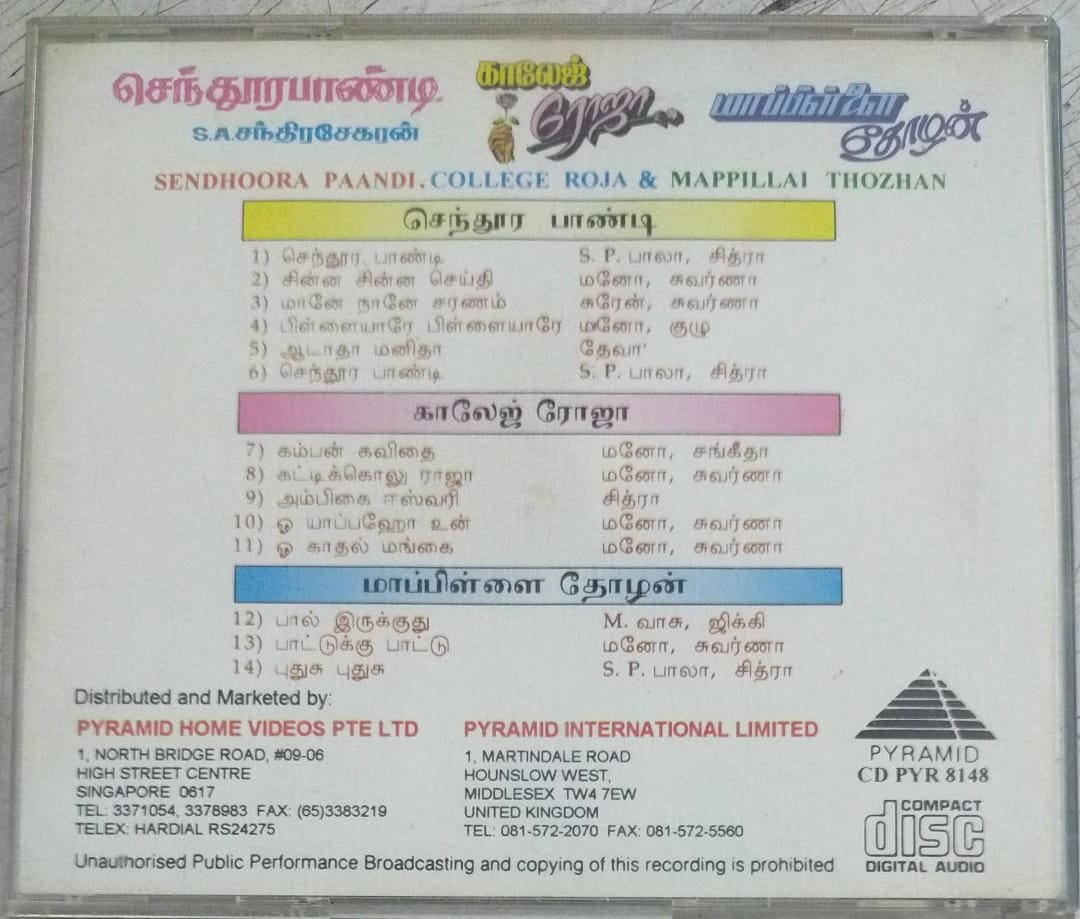 Sendhoora Paandi- College Roja – Mappillai Thozan Tamil Film Audio CD By Deva