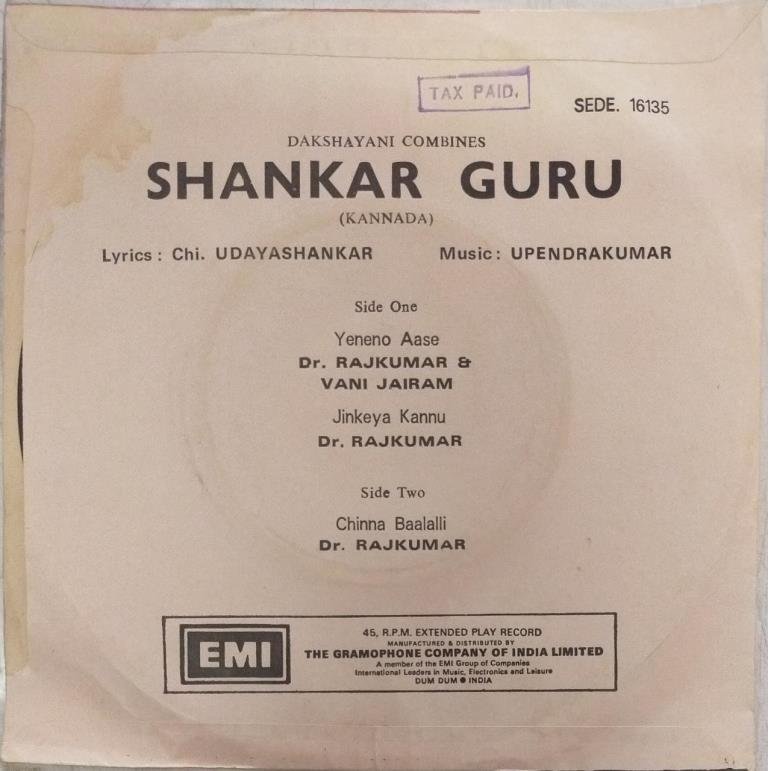 Shankar Guru kannada Film EP VInyl Record by Upendrakumar