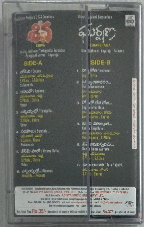 Shiva -Gharshana Telugu Film Audio Cassette by Ilayaraaja ( sealed pack)