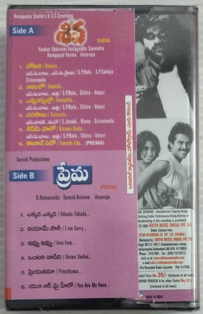 Shiva – Prema Telugu Film Audio Cassette by Ilayaraaja (sealed pack)