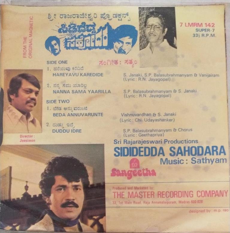 Be the first to review “Siddedda Sahodara kannada Film EP VInyl Record by Sathyam”