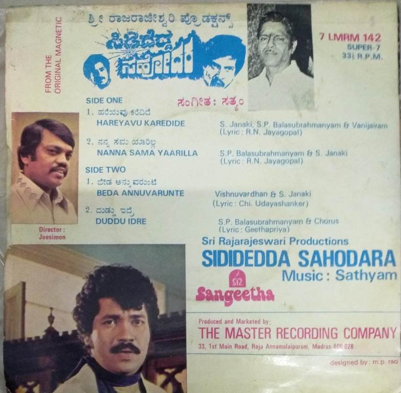 Sididedda sahodara Kannada film EP Vinyl Record by Sathyam