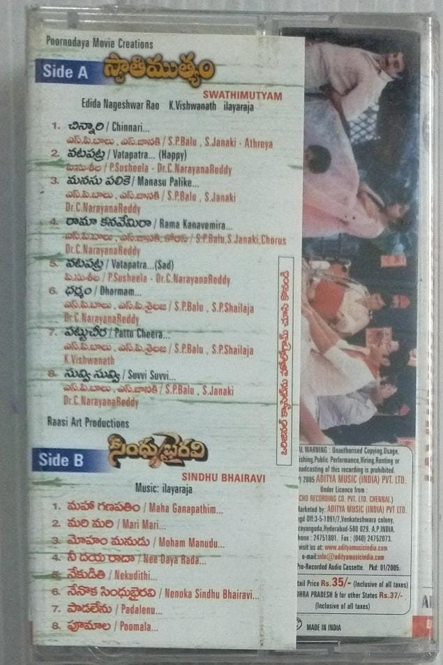Sindhu Bhairavi- Swathy muthyam Telugu Film Audio Cassette by Ilayaraaja ( sealed pack)