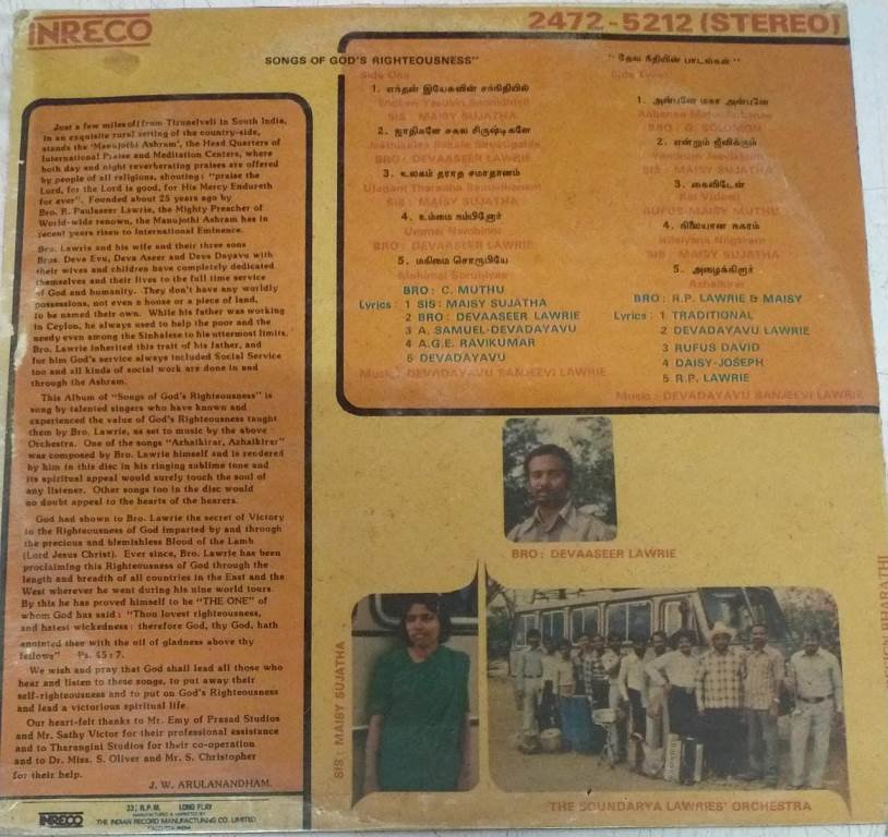 Songs of God’s Christian devotional Tamil LP Vinyl Record
