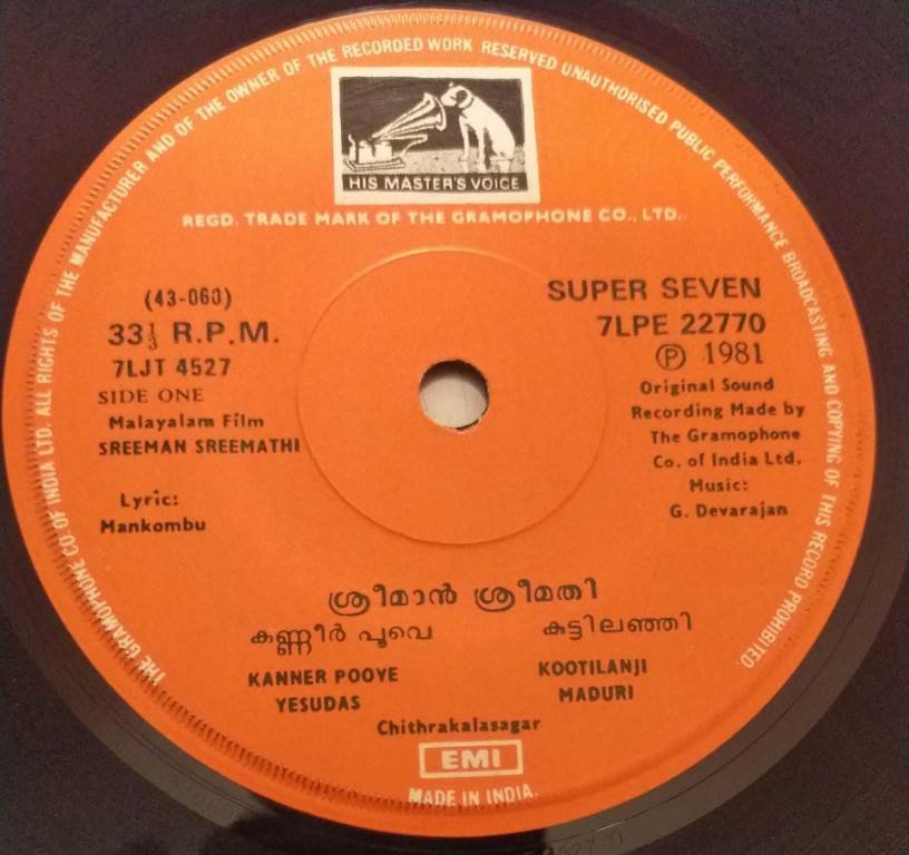 Sreeman Sreemathi Malayalam Film EP Vinyl Record by G Devarajan