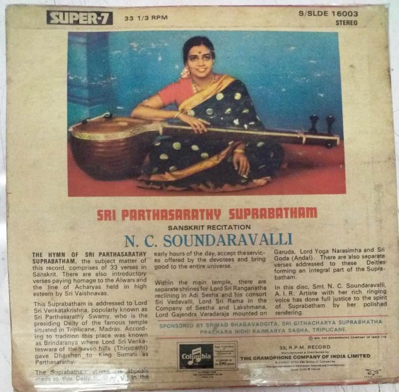 Sri Parthasarathy Suprabatham Sanskrit Devotional EP Vinyl record by N C Soundaravalli