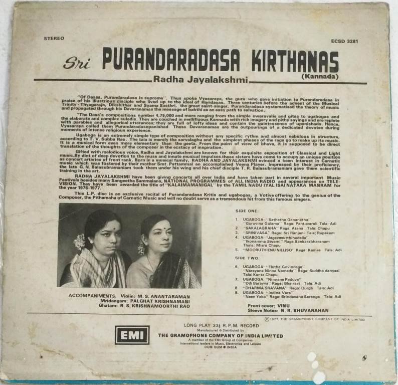 Sri Purandaradasa Kirthanas Kannada LP Vinyl Record by Radha Jayalakshmi