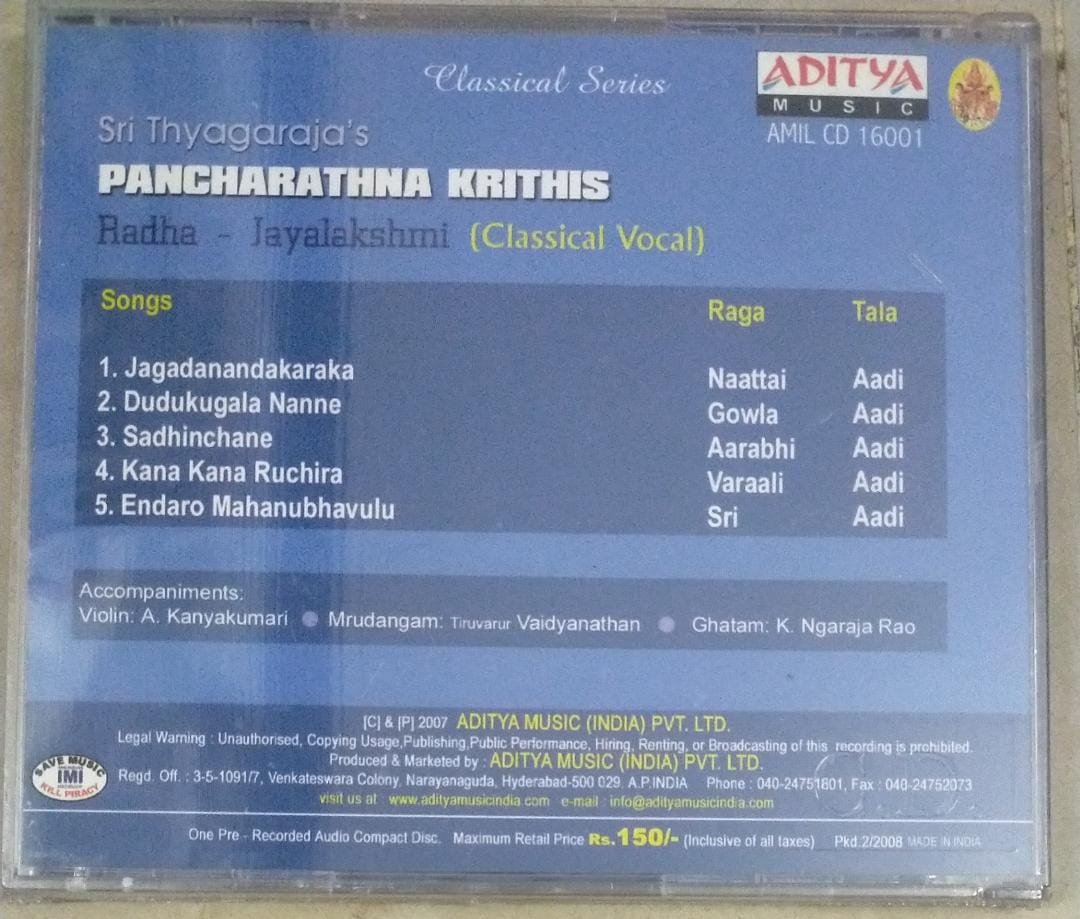 Sri Thyagaraja’s Pancharathna Krithis Classical Audio CD by Radha Jayalakshmi