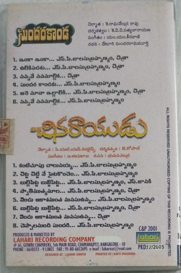 Sundarakanda- Chinna Rayudu Telugu Film Audio Cassette by Ilayaraaja ( sealed pack)