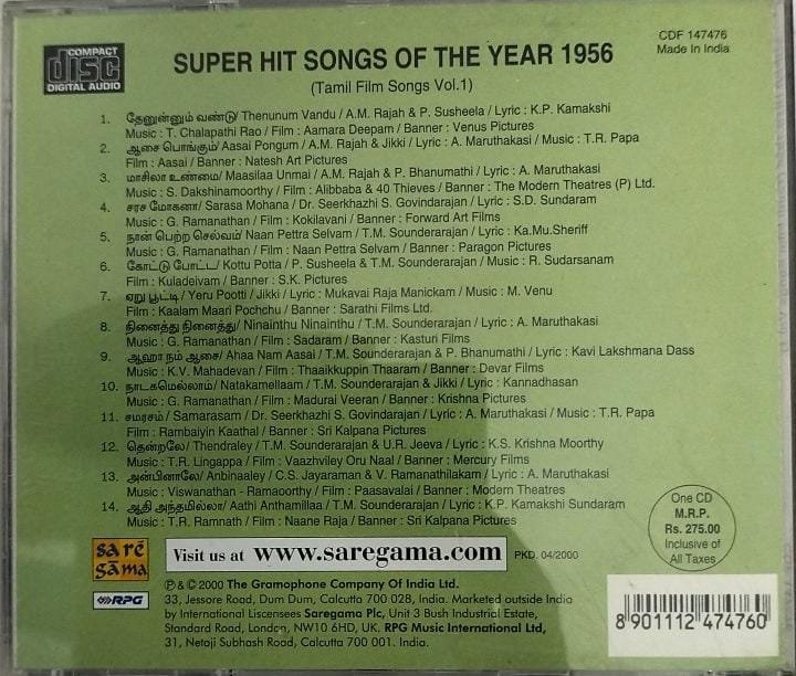 Super Hits songs of the year 1956 Tamil Film Audio CD