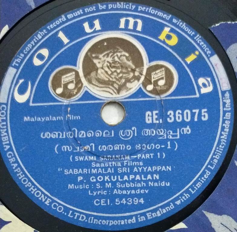 Swami Saranam Malayalam Film 78 RPM record by Baburaj 36075