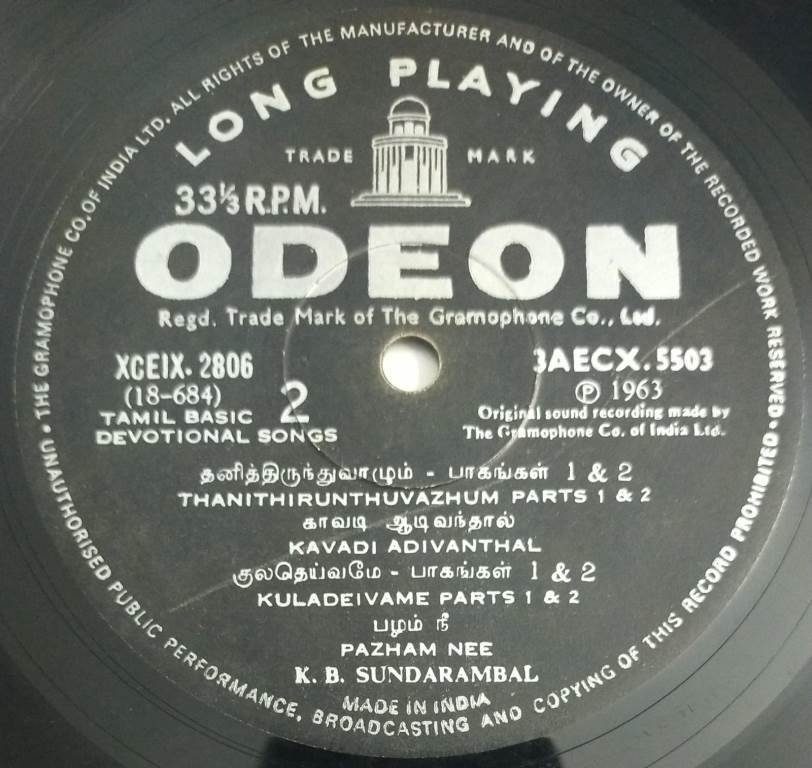 Tamil Devotional Songs LP Vinyl Record by K B Sundarambal 5503