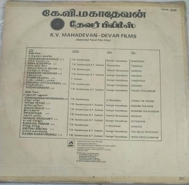 Tamil Film Hits from MGR Starrer movies LP Vinyl Record