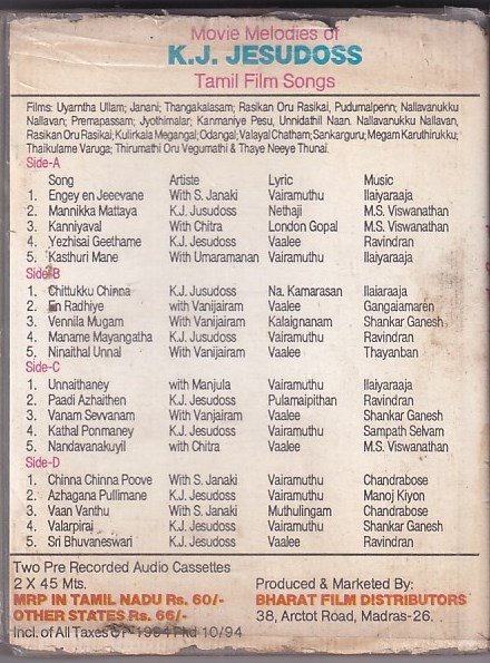 Tamil film songs sung by K J Jesudass Audio Cassette set of 2 nos