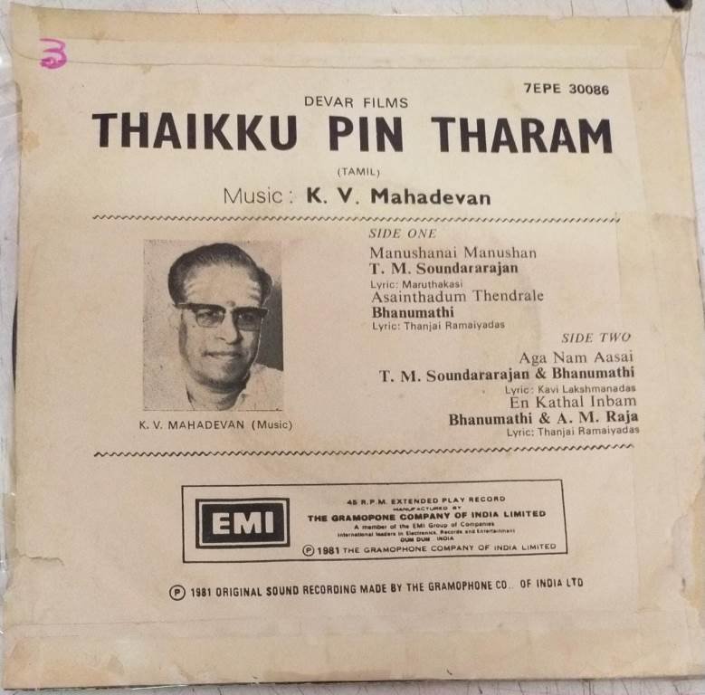 Thaikku Pin Tharam Tamil Film EP Vinyl Record by K V Mahadevan
